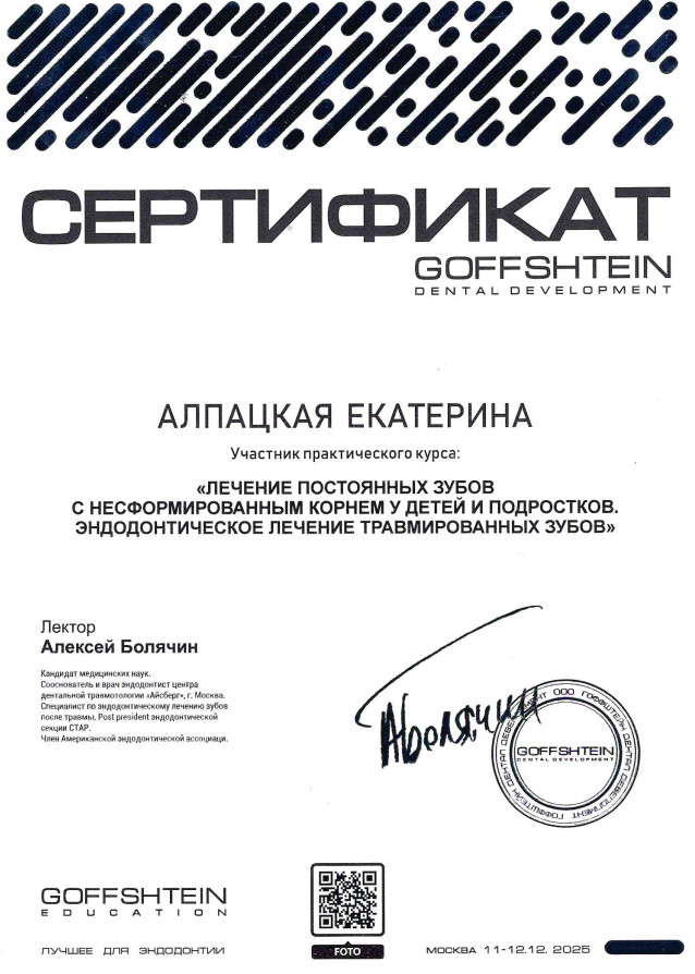 - Сертификат по детской стоматологии: срок действия до 27.09.2029